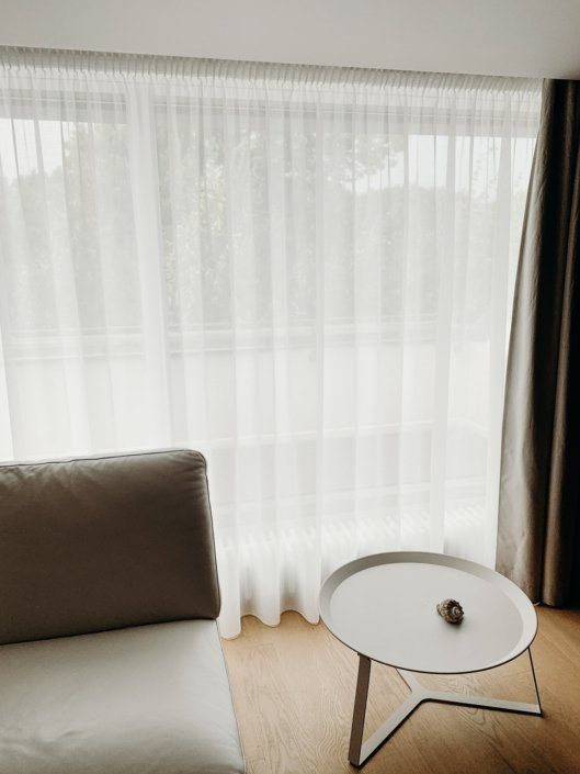 Dienas un nakts aizkaru projekts dzīvoklī. Plāni, gaisīgi dienas aizkari un tumši, bieži nakts aizkari. Ļoti eleganta izvēle. Neitrāli toņi, kas neatstāj izsmalcināto noskaņu telpā.