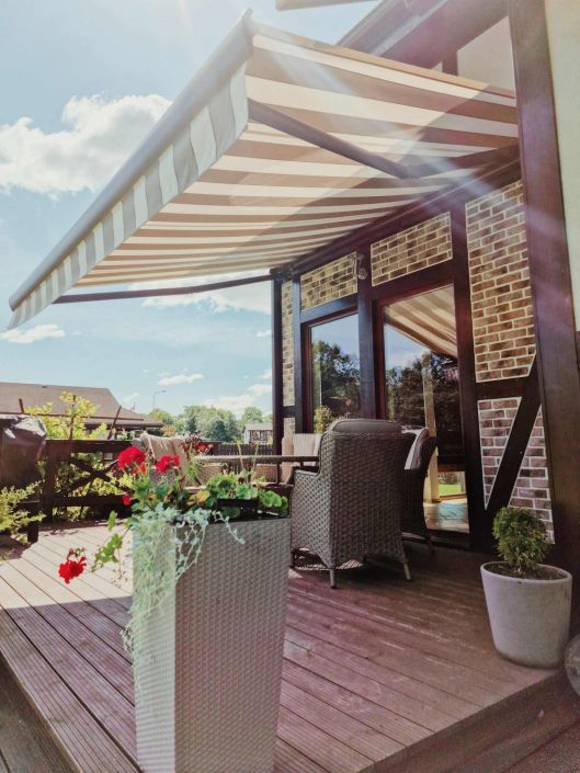 Markīze privātmājai. Šajā projektā tika izvēlēta markīze ar strīpām brūnos un bēšos toņos. Mājokļa saimniekiem jau iepriekš bija izveidota terasīte, kur baudīt siltos vasaras rītus un vakarus. Līdz ar to pietrūka vēl tikai markīze, kas arī dienas saulainajā daļā ļautu baudāmi pavadīt laiku terasē.